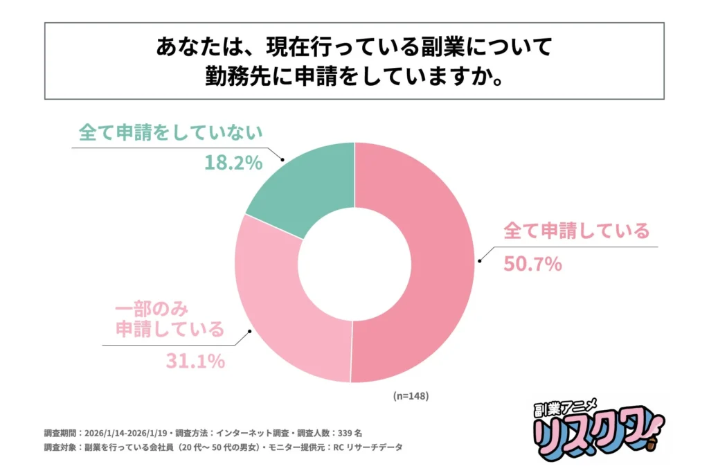 さらに驚くべきは、副業を行う際に勤務先への申請が必要だと回答した会社員の半数以上(50.9%)のうち、約半数(49.3%)が、現在行っている副業について、一部または全てを勤務先に申請していないという実態です。