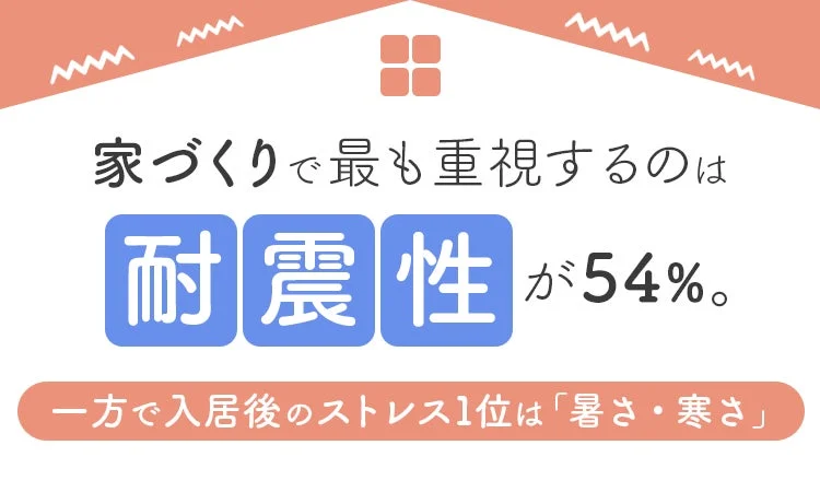 家づくりで最も重視するのは耐震性が54%。一方で入居後のストレス1位は「暑さ・寒さ」