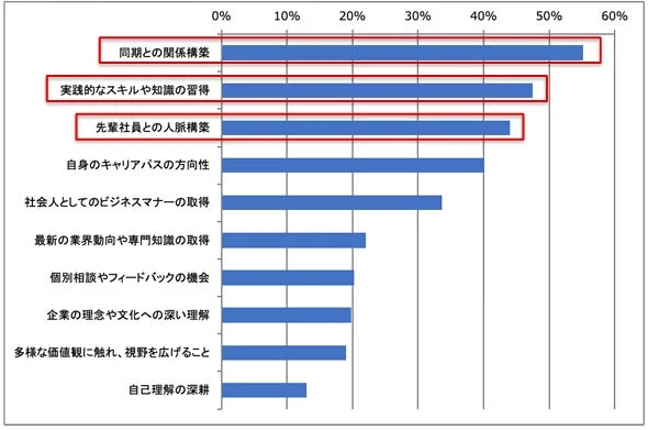 企業の人事担当者を対象とした調査では、「同期との関係構築」(55%)が新入社員研修で最も重視されている要素であることが明らかになりました。次いで「実践的なスキル・知識の習得」や「先輩社員との人脈構築」が上位に挙がり、業務スキル以上に人的ネットワークづくりが重視されている実態が示されています。